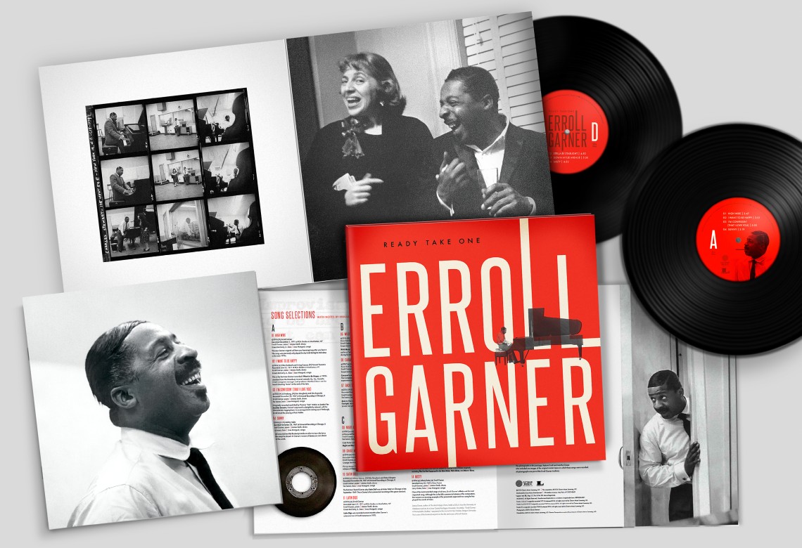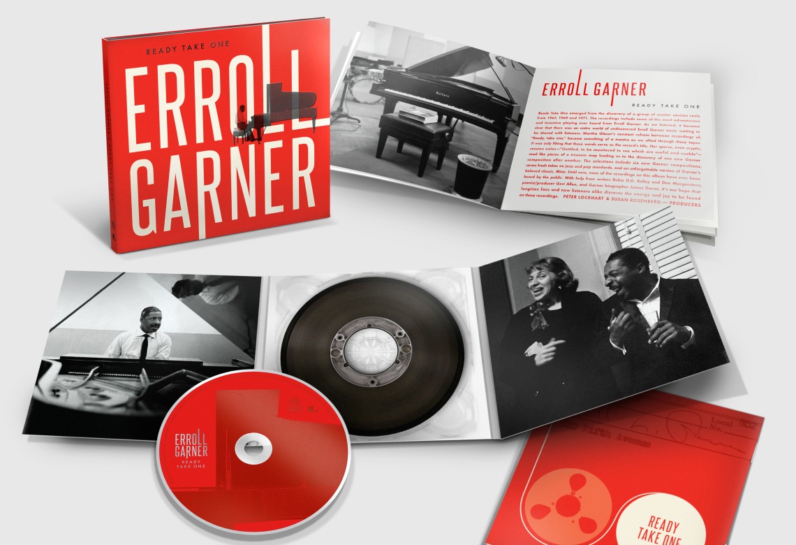 SONY was to release Ready Take One, an album of unearthed studio sessions by the legendary jazz pianist Erroll Garner. The vinyl and CD design embodies the upbeat, lighthearted nature of the music. Red, black and ivory were chosen to provide balance with pops of color. Ephemeral imagery that provides a glimpse into the studio life and recordings was selected.